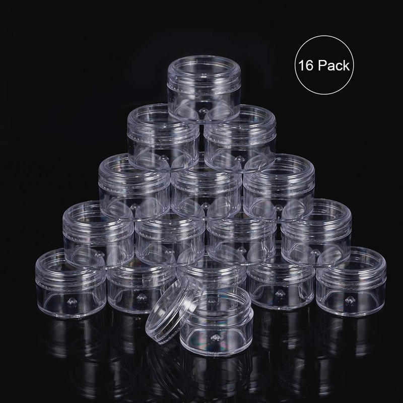 - Package Contents: Set of 16 transparent storage cases; Size: Height: Approx. 1.2 inches (3.1 cm); Bottom Diameter: 1.7 inches (4.3 cm); Capacity: 0.9 fl oz (25 ml)