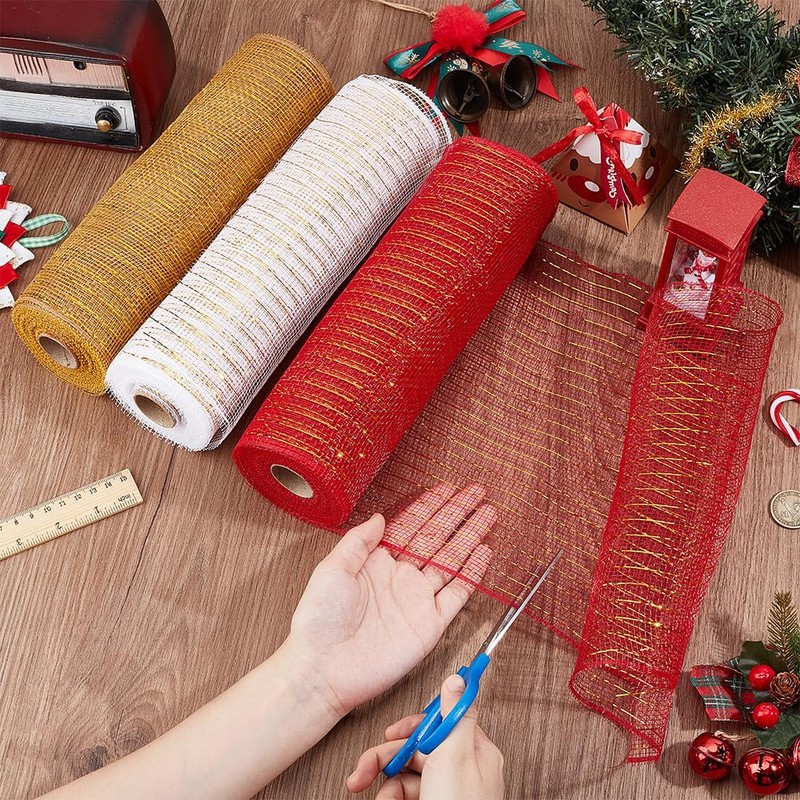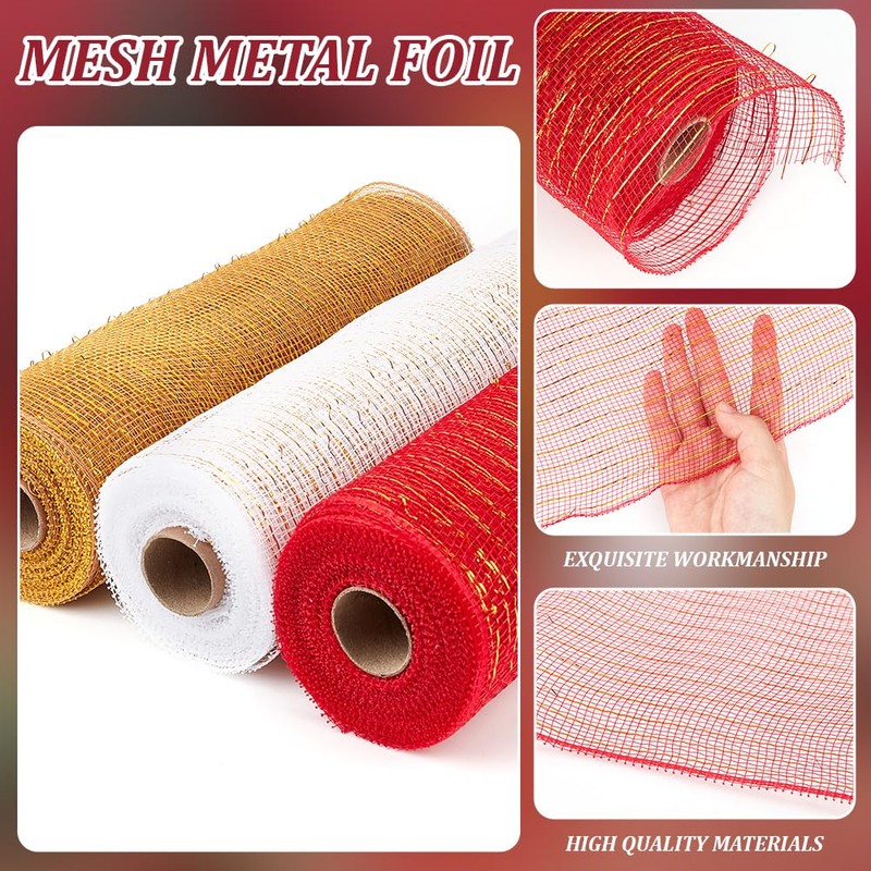 BENECREAT 3 Rolls 27m Gold Red White Mesh Ribbon, 26cm Plastic Mesh with Gold Wide Foil Mesh Ribbons Christmas Ribbon for Wreath Christmas Tree Decoration