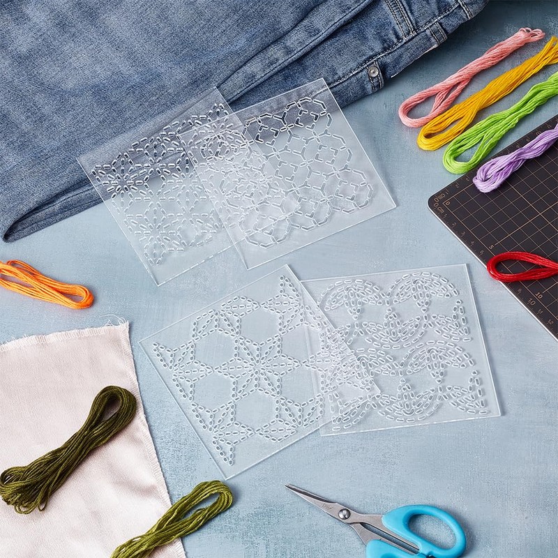 BENECREAT 4Pcs Acrylic Sashiko Stencil, Square Geometric Dotted Hexagonal Pattern Embroidery Tool Drawing Line Template for Hand Quilting and Embroidery, 3mm Thick