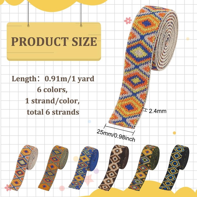 BENECREAT 6 Styles Jacquard Elastic Bands, 6 Yards/5.5 m Stretch Elastic Band, 25 mm Wide Polyester Elastic Band Waistband, Elastic Woven Jacquard Band for Sewing, Crafts, DIY