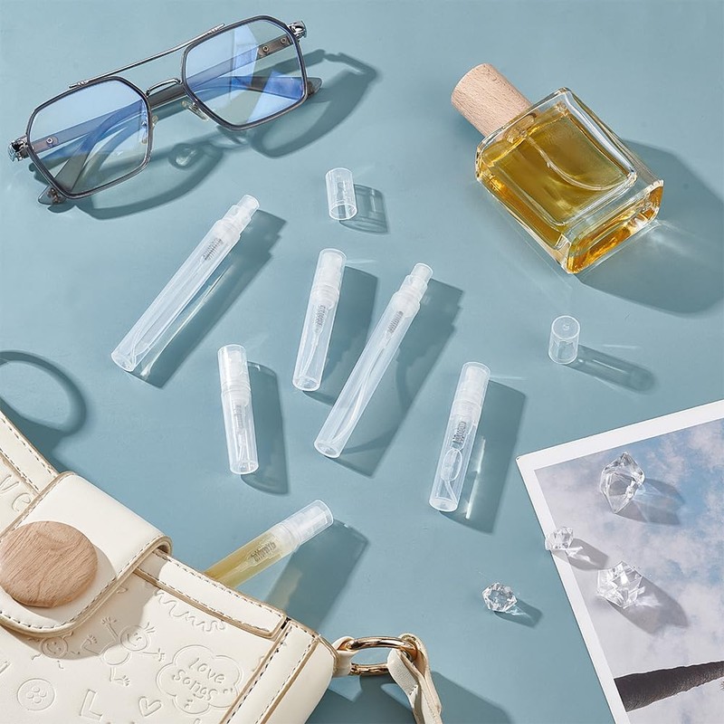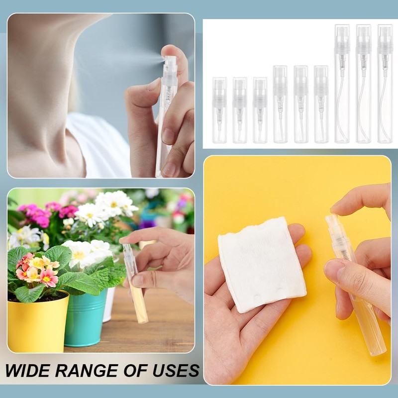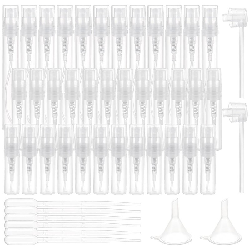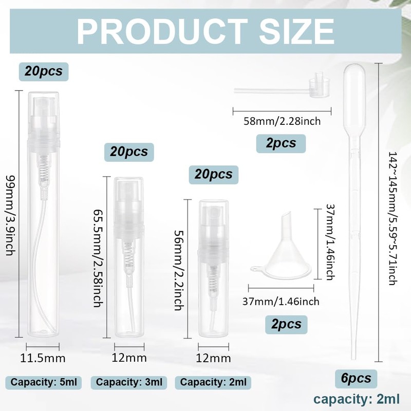 - Size Reference - Spray bottle: 2ml/0.06 oz, 3ml/0.1oz and 5ml/0.17oz 20pcs each; Plastic pump: 49.6x2.5mm/1.95x0.09 Inch; Dropper: 2ml/0.06 oz; Funnel hole: 2mm/0.07 Inch