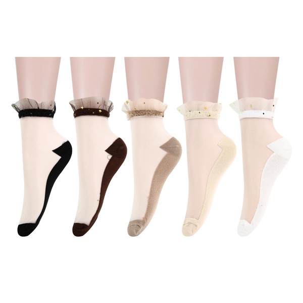 Benefeet Sox Sheer Socks Ankle High Lace Ruffle Ankle Socks Novelty Pretty Mesh Short Socks Cute Transparent See Through Low Cut Socks Ultra Thin Silk Nylon Summer Socks with Shiny Star 5 Pack