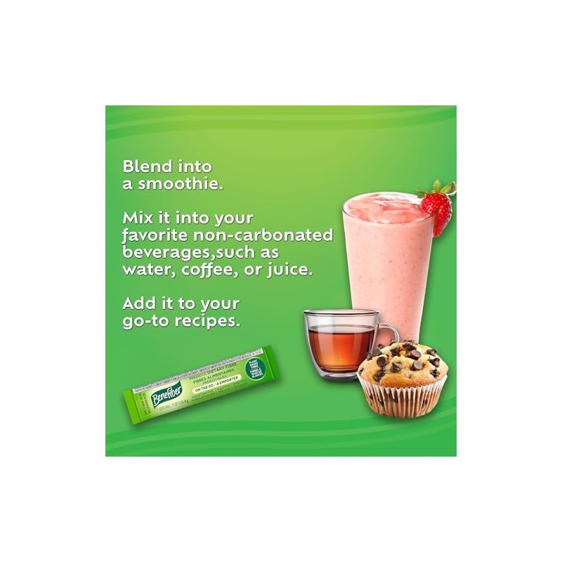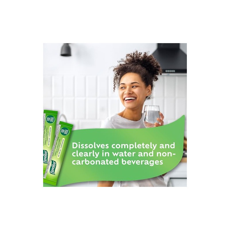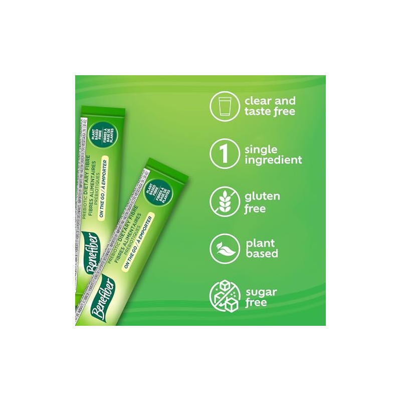 - Enjoy the convenience of Benefiber On the Go Prebiotic Dietary Fibre with 28 (4 g) unflavoured stick packs that dissolve completely in water and non-carbonated beverages.