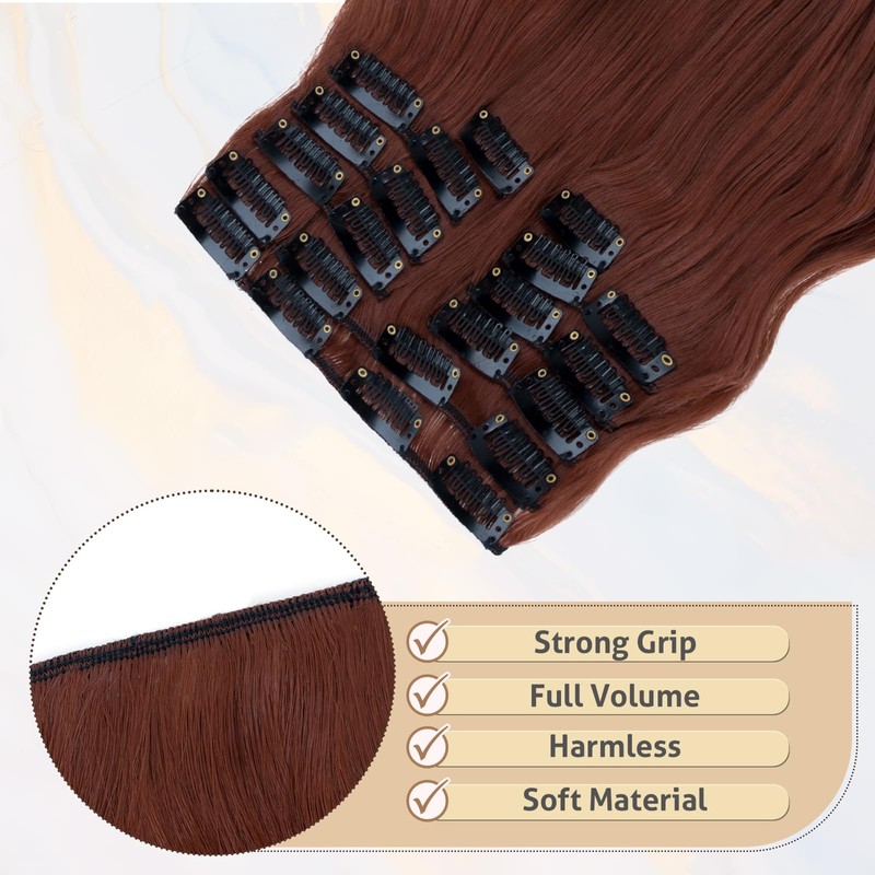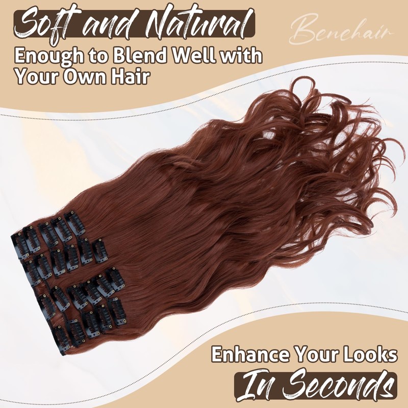 Benehair 22" Clip in Hair Extensions 12 Pcs Long Curly Wave Hair Extensions Clip in Full Head Synthetic Fiber Dark Auburn Hair Piece for Women Girls(Dark Auburn, 180g)