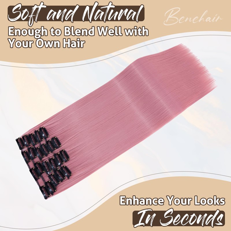 Benehair 22" Clip in Hair Extensions 12 Pcs Long Straight Hair Extensions Clip in Synthetic Fiber Full Head Natural Extension Pink Hair Piece for Women(Pink, 180g)