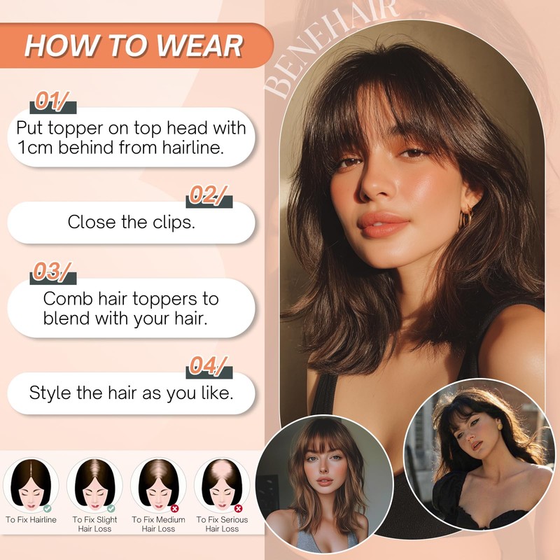 - Premium Human Hair Topper: Crafted with high-quality Brazilian remy human hair,Benehair topper is silky and smooth with no tangling or shedding. Soft, healthy, and glossy, it can be washed, cut, dyed, curled, or straightened just like your natural hair. However, please note that frequent styling may lead to dry ends or split ends