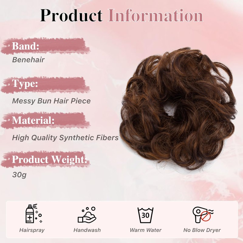 Benehair Messy Bun Hair Piece Curly Wavy Hair Scrunchies Messy Bun Scrunchie Synthetic Donut Updo Hair Pieces for Women Girls (Dark Brown with Hightlight, 25g)