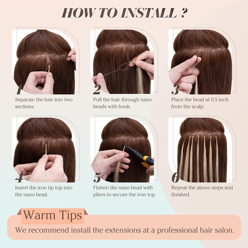 - 【Warm Tips】After wearing nano extensions human hair for a while, the beads may become loose due to washing, sleeping, etc., so we recommend re-flattening and replacing the beads every 2 weeks.Promote the expertise of professional stylists in installing nano ring extensions correctly for the best results.