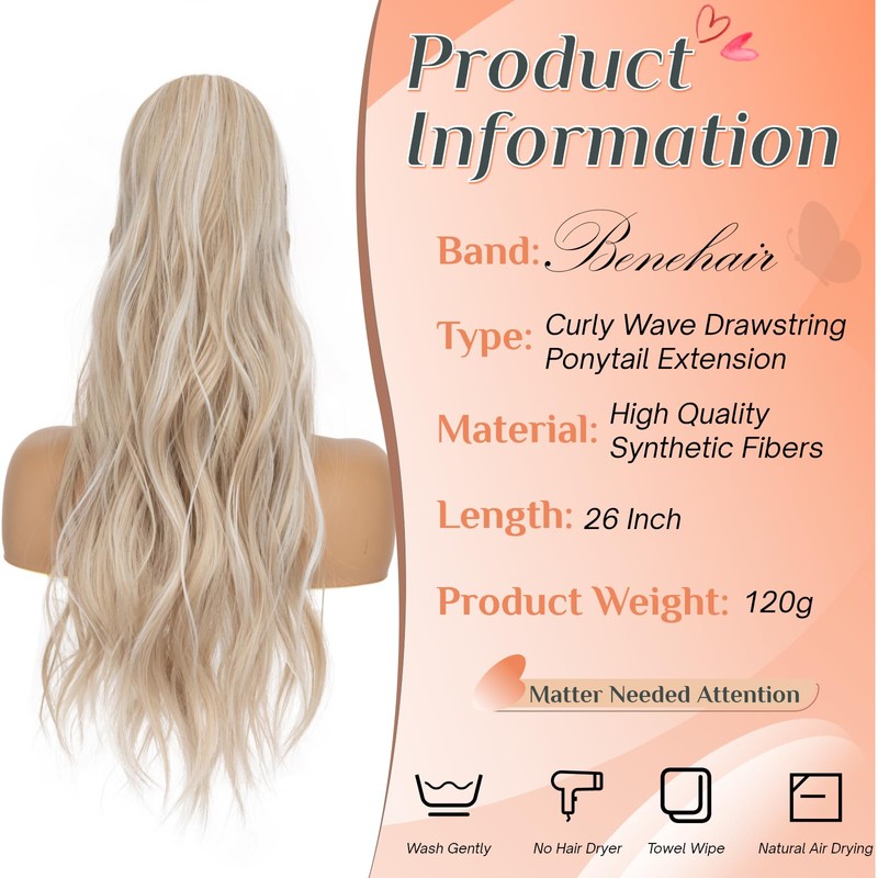 Benehair Ponytail Extension 26" Long Curly Wave Clip in Hair Extension Natural Fashion Drawstring Ponytail Synthetic Clip in Ponytail Hair Pieces for Women (Light Brown with White Blonde, 120g)