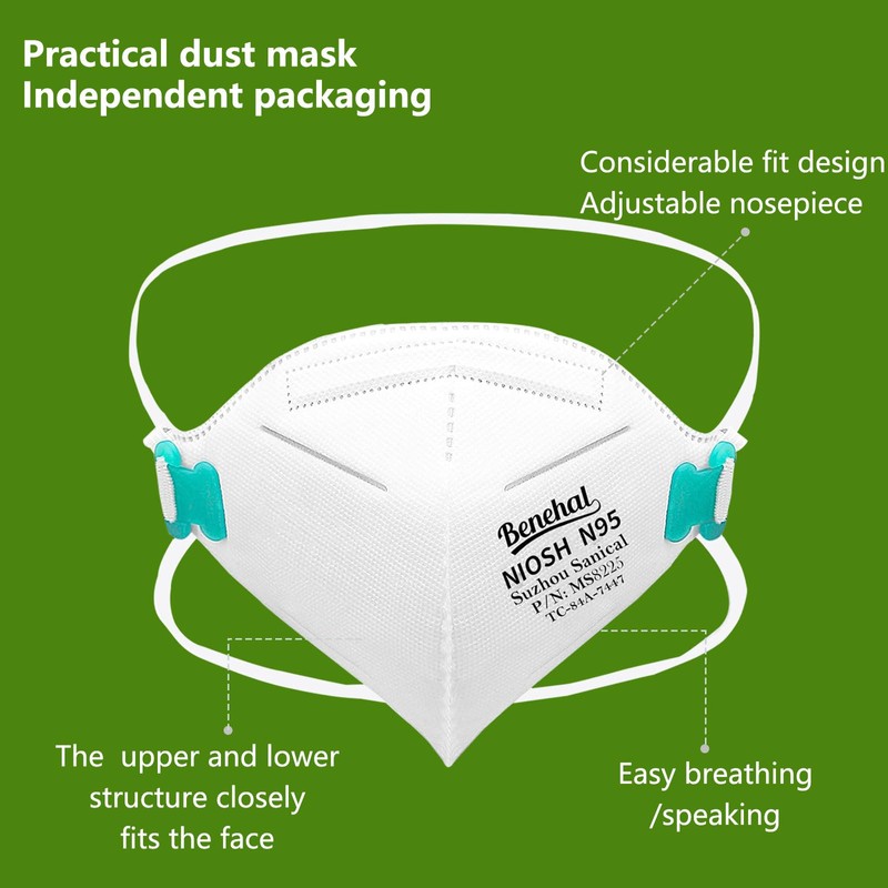- NIOSH APPROVED N95 MASK RESPIRATOR - Approval Number: TC-84A-7447 - certified for at least 95% particulate filtration efficiency. Manufacturer: SUZHOU SANICAL PROTECTIVE PRODUCT MANUFACTURING CO., LTD.