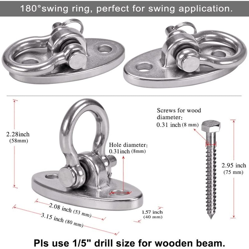 - EASY TO INSTALL: There are two holes in the base of the swing hanger, and use screws through this hole to fix it on the concrete ceiling or wooden beam(Screws are not included, please purchase screws yourself). The swing ring can be detached, even if your chain, rope or connecting buckle is closed, it can be connected. So it can be easily connected to items such as the hammock, swing chair or sandbag that you need to hang.