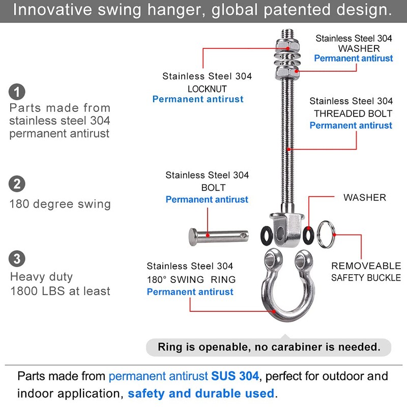 - INNOVATIVE DESIGN: Design with a strong heavy duty hook, the hook can swing back and forth with 180°. Ensure the safety, we have assembled an O’ ring with material SUS304 stainless steel to avoid the shaft slide out, also the buckle of the hook is strong enough to ensure the safety use.