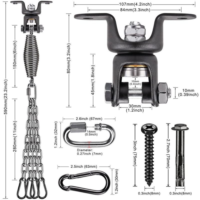 BeneLabel Heavy Duty Boxing Punching Bag Hanger Chain with Spring, 350 LB Capacity, 360° Rotation Wood Beam Holder with 4 Chains and 4 Carabiners, 2 Wood Screws for Wooden Sets