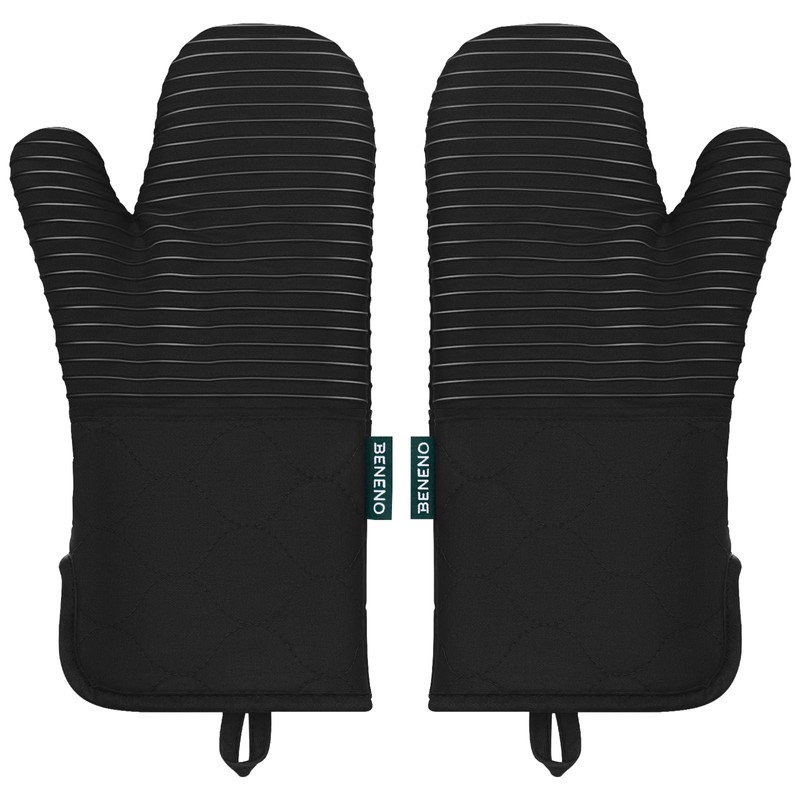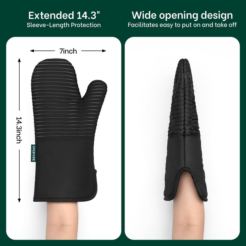 Beneno Oven Mitts, Heat Resistant Kitchen Oven Mitts with Non-Slip Silicone Stripes, Long 14.3" Cuff with Wide Opening Design, Quilted Cotton Terry Lining Comfortable & Flexible to Use, 2Pcs Black