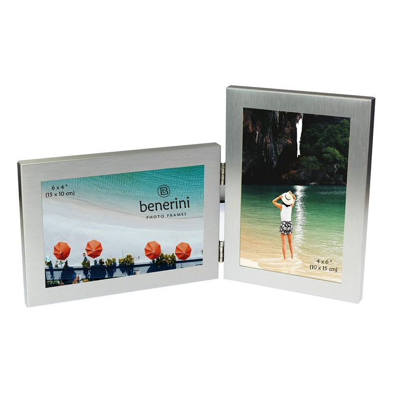 benerini Brushed Aluminium Satin Silver Colour Twin 2 Picture Double Folding Photo Frame Gift - Takes 2 Standard 6 x 4 inch photographs (1 Landscape and 1 Portrait Style)
