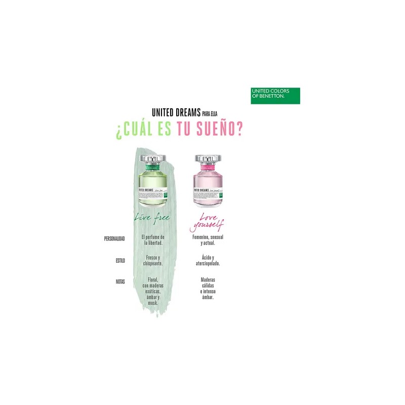 Déjate inspirar por tu poder de soñar. Porque todo lo que conocemos es fruto de un sueño. United Dreams. La libertad nos concede la oportunidad de ser nosotras mismas; de expresar quienes somos sin miedo y sin prejuicios. ¡Vive con libertad! Live Free de Benetton es un perfume fresco y con carácter, es una invitación a vivir libre