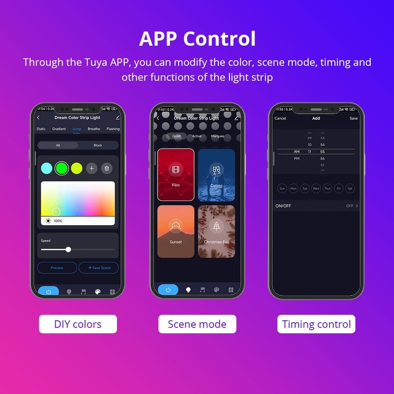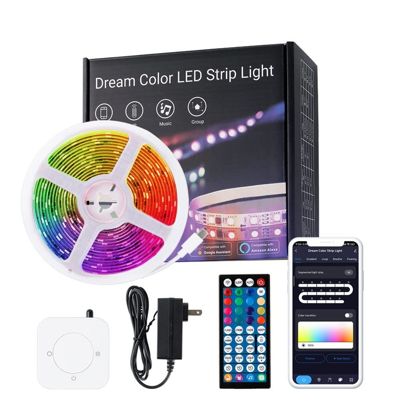 - - Dreamcolor RGBIC LED light strip: Our LED music light adopts advanced IC chip, which can be colorful like a rainbow at once, with the effects of chasing, jumping, and flashing. More fancy and brighter than RGB LED lighting. not only use IR remote to control but also turn on/off, set timmer, adjust light sences and music modes by TUYA app from anywhere, anytime.