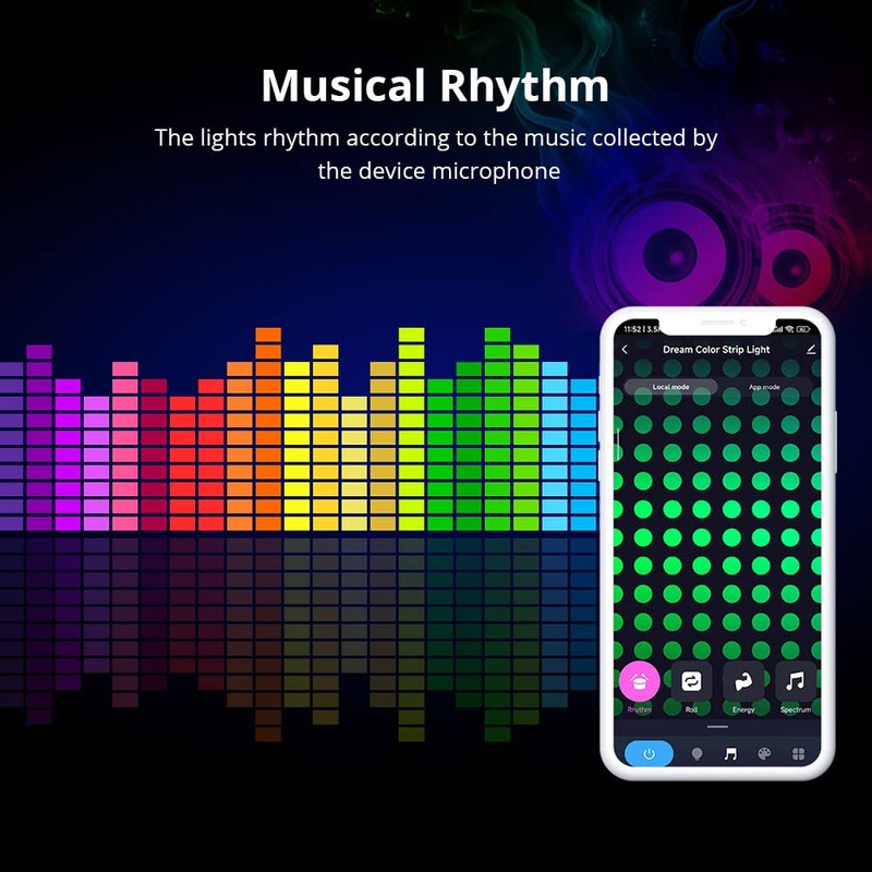 - - Sync with music: press music button on ir remote or finger tap on "smart life" app to get the sound activated option and play music or vocal, the built-in high-sensitivity mic will motivate the string to dance with the ambiance sounds.