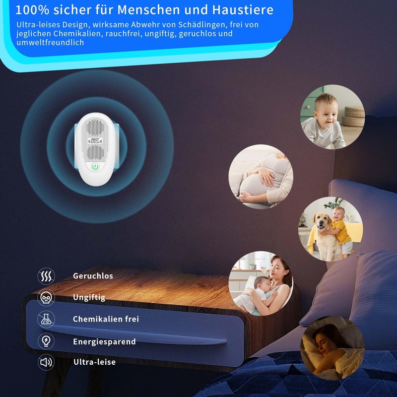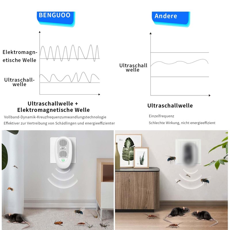- Wirksame Abwehr gegen Mäuse und Ratten: Leistungsstarke Ultraschallwellen stimulieren das Nerven- und Hörsystem von Nagetieren und vertreibt sie. Die Schädlingsaktivität kann in den ersten zwei Wochen zunehmen. Nach 4 bis 5 Wochen ist Ihr Zuhause jedoch frei von Schädlingen.
