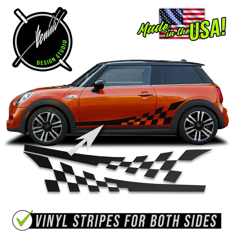 BENINI DESIGN STUDIO Side Checkered Flag Racing Stripes Graphics Vinyl Decal Sticker Checkers Racing Stripes Compatible with Mini Cooper S Base 2014-2024 (Gloss Black)