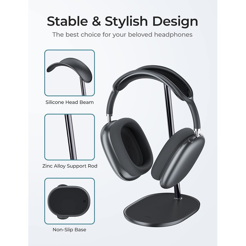 - Superior stability and premium materials: our AirPods Max stand embodies the highest standards of design and quality. The centre bar is made of high quality zinc alloy, which ensures exceptional stability and durability. The non-slip rubber feet on the bottom provide optimal grip and prevent any slipping. The soft padded top reliably protects your valuable headphones - whether AirPods Max or others - from scratches and damage.