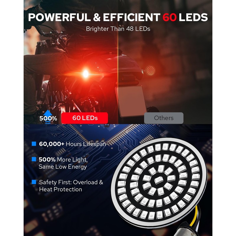 - 【60,000+ HOURS INDUSTRY-LEADING LONGEVITY】Engineered with advanced circuit protection and optimized thermal management, these rear turn signals deliver ultra-low power consumption and unmatched 60,000+ hour durability - outlasting your motorcycle's lifespan.