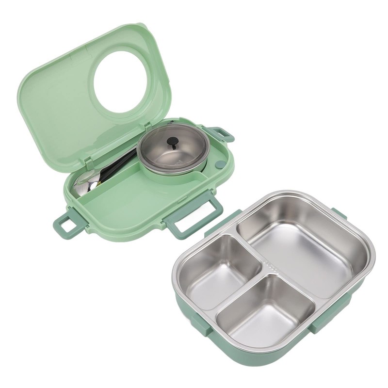 Bento Lunch Box, 1100ml Double Layer 3 Grid Design, 304 Stainless Steel Thermal Lunch Box with Chopsticks Spoon Soup Bowl, Food Container for Kids Students Adults(Green)