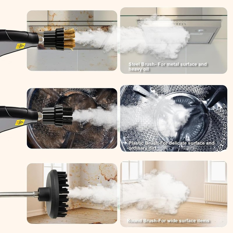 - 5 different Brush Heads: The handheld steam cleaner for home with 5 different brush heads, there are glass scraper, high temperature nozzle, large nylon brush, nylon brush, steel brush, which can meet your cleaning needs in different scenarios. Ideal for cleaning stoves, floors, walls, microwave ovens, washing machines, refrigerators, etc. 8.7-inch extension pole is easy to easily reach high or far corners for deep cleaning