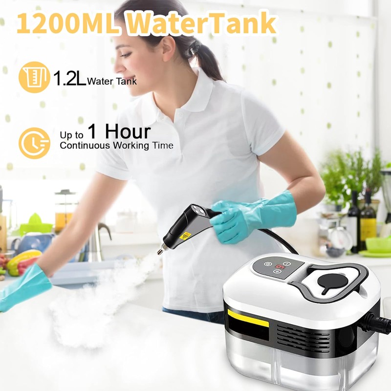 - Large Capacity Water Tank: Portable car steamer for cleaning is equipped with 1200ml capacity water tank, a full water can be used continuously for half an hour without frequent replenishment, greatly improving your cleaning efficiency. In addition, you can also add solution or detergent to the water source to enhance the cleaning effect according to your needs. Tip: You need to empty the remaining water in the water tank after cleaning
