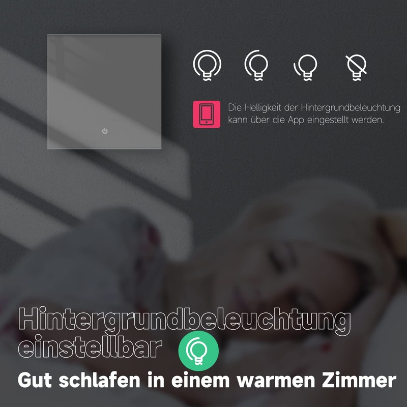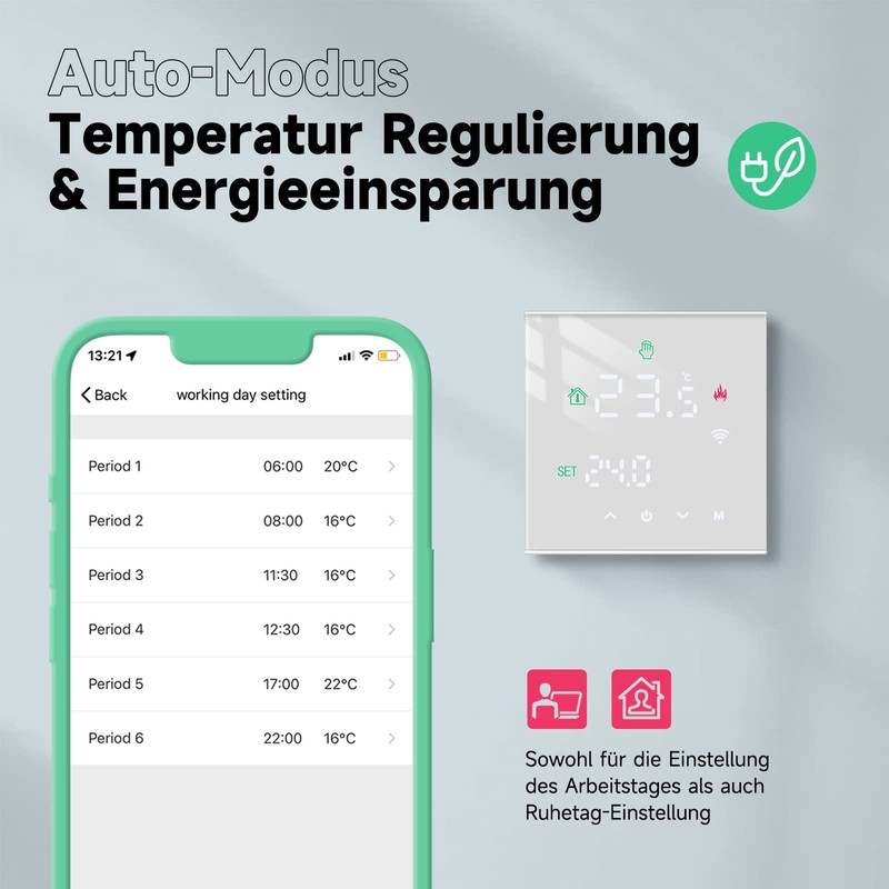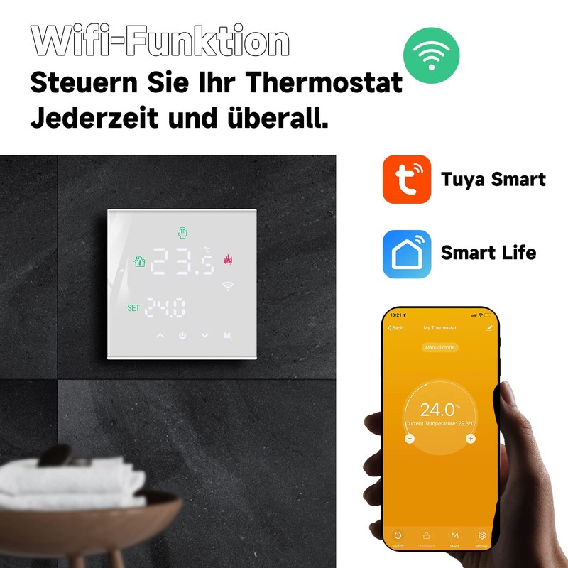 • WiFi function: remote control of the thermostat by mobile phone Tuya app, only need to control mobile phone, you can achieve the room thermostat switch, running schedule, backlight setting, home zoning control, etc., make your life smarter and more convenient. Compatible with Alexa, Google Assistant, you can turn the thermostat on/off and adjust the temperature with just a simple voice command; 2.4 GHz network required.