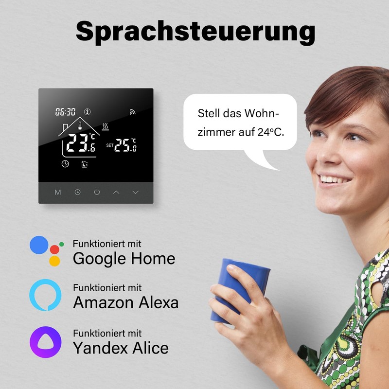 - Voice control: Control your intelligent thermostat with voice assistant - Alexa or Google Home. Control the temperature at home via voice command, for example: Alexa, set the thermostat to 23°C.