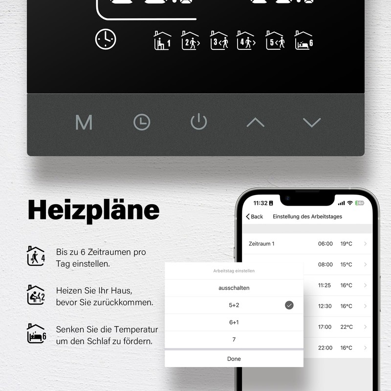 - DIY heating program: create intelligent programs and determine which room to be heated. With the weekly planning mode of 5+2/6+1/7 days, you can set different temperatures with up to six periods per day to make your life comfortable and energy-saving.