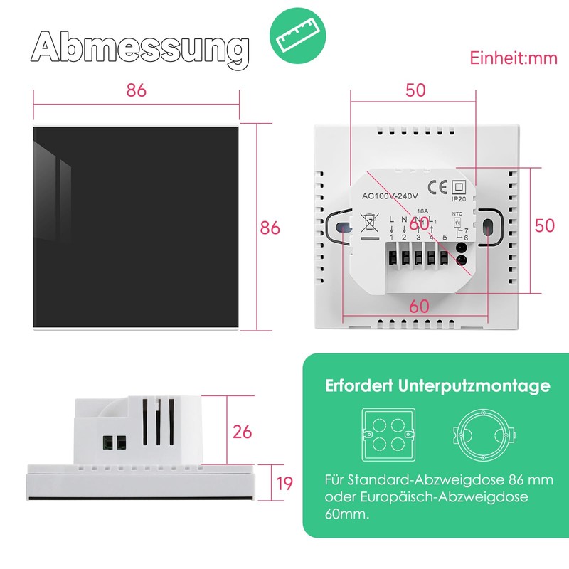 - 【Product list】: water heating thermostat (flush-mounted, supports max. Current 3A, voltage AC100-240V); detailed instruction manual in paper form; 2 screws for mounting. Dimensions: 8.6 x 8.6 x 4.5 cm