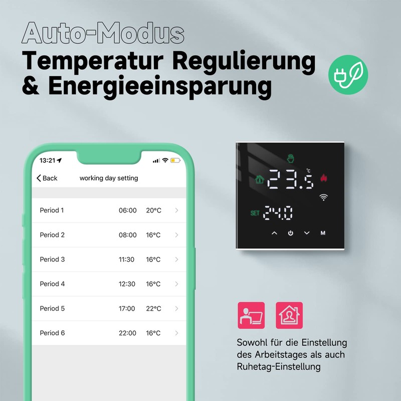 - WiFi function: remote control of the thermostat by mobile phone Tuya app, only need to control mobile phone, you can achieve the room thermostat switch, running schedule, backlight setting, home zoning control, etc., make your life smarter and more convenient. Compatible with Alexa, Google Assistant, you can turn the thermostat on/off and adjust the temperature with just a simple voice command; 2.4 GHz network required.