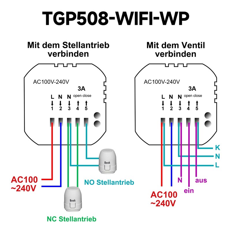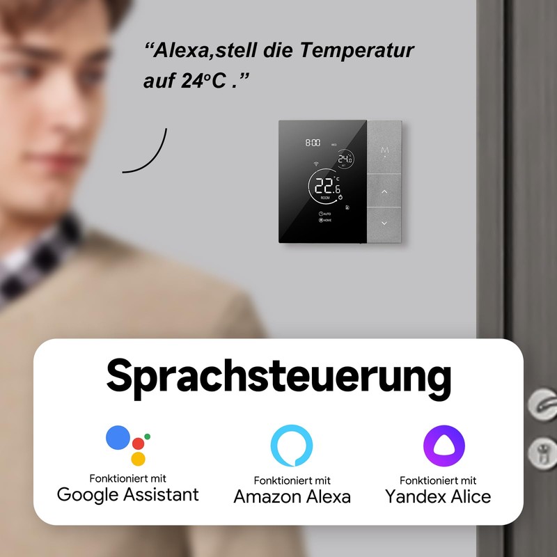 - Voice control: compatible with Alexa and Google Voice Assistant, implement the switch and temperature setting of the temperature control via voice command. Alexa, for example, sets the thermostat to 23 °C