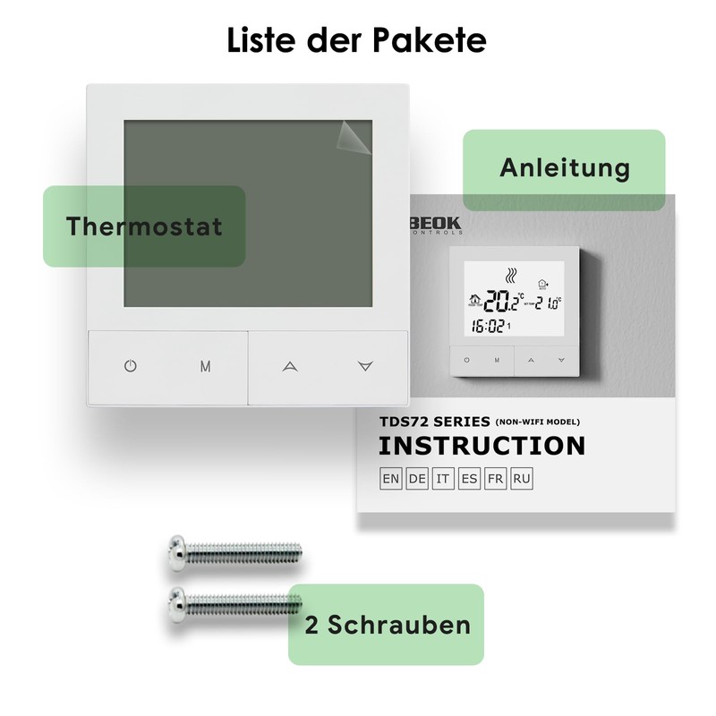 - Power supply: AC 200-240V, 50-60Hz; contact capacity: 3A. Package list: 1 x thermostat, 2 x screws, 1 x manual (English language not guaranteed)