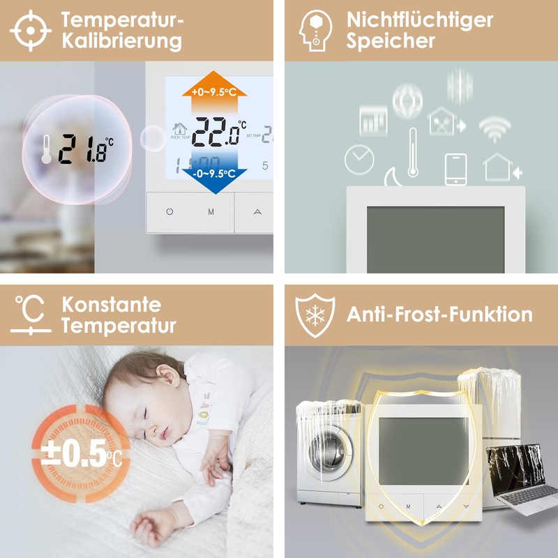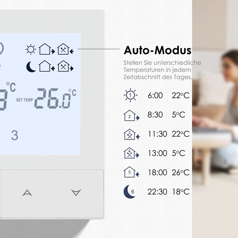 - [Programmable] With the weekly planning modes 5+2/6+1/7, you can set different temperatures with up to six periods per day to make your life comfortable and energy efficient.