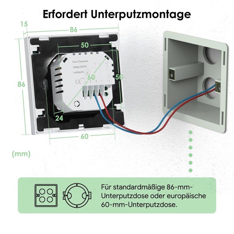 - [Easy installation and use] It is wall mounted, connect the power box according to the wiring diagram. Functions: temperature compensation, 0.5℃ temperature accuracy, anti-freeze function, power off memory function, child lock, factory reset etc; 2 operating modes: automatic mode and manual mode.