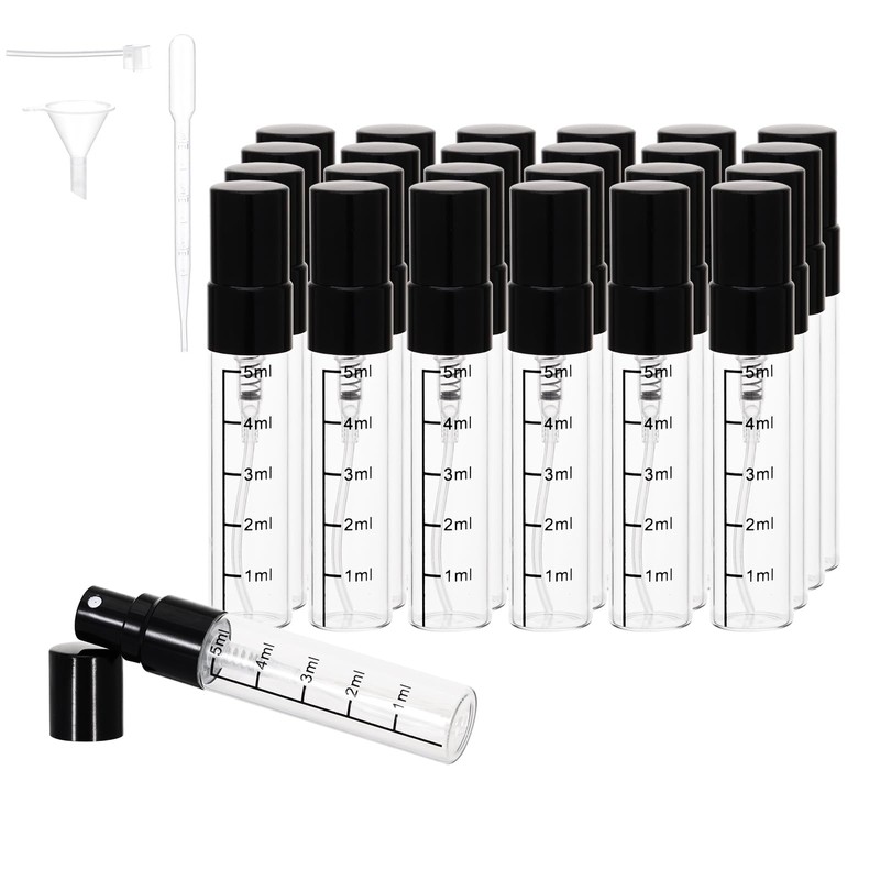 - CAPACITY: Set of 24 clear glass perfume travel refillable bottles, each empty bottle holds 5ML of liquid and features a fine-mist spray atomizer for precise application, easy to refill and no leakage