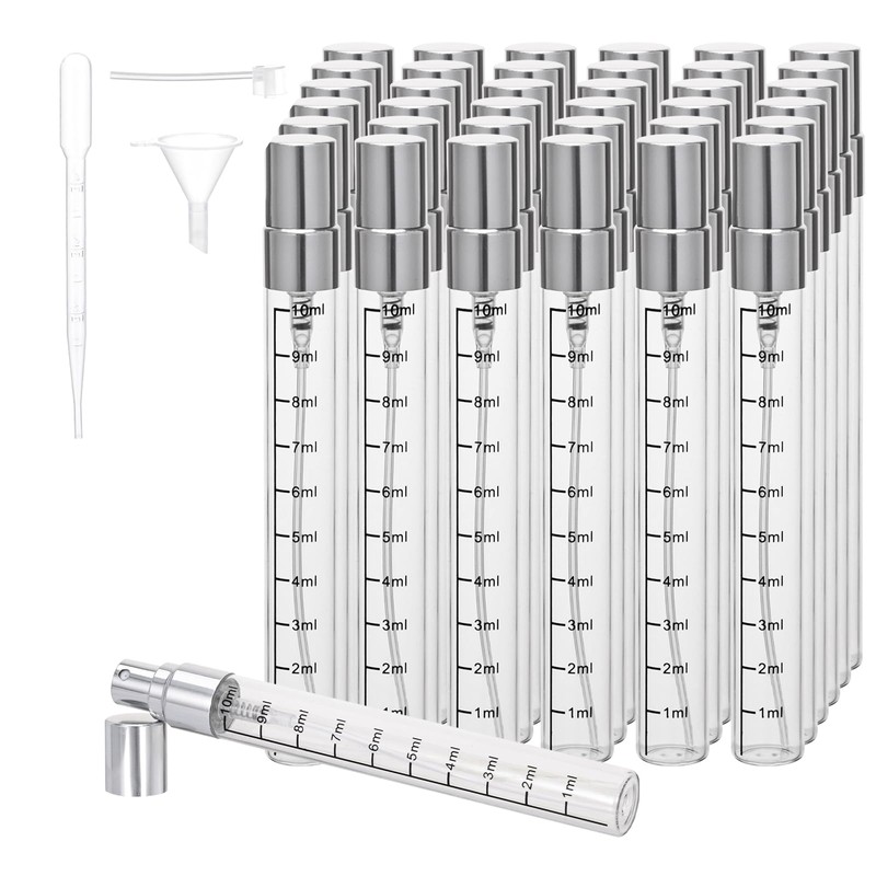 - SET INCLUDES: Package contains 36 glass spray bottles with refill atomizer sprayer making kits: funnel, dropping pipette and dispensing pump transfer tools, allowing you to carry multiple scents or share with family members. Make it a thoughtful gift for anyone.