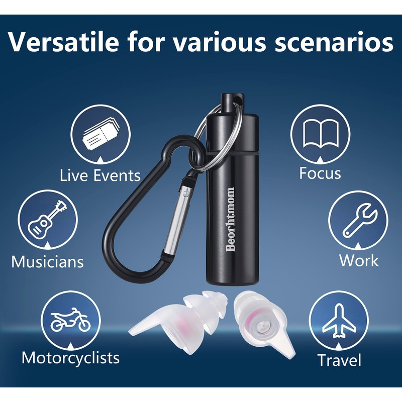 - VERSATILE AND RELIABLE FOR EVERY OCCASION – The Beorhtmom Earplugs are ideal for a wide range of situations, including concerts, festivals, sporting events, noise sensitivity, tinnitus relief, motorcycle riding, and for musicians or drummers looking to protect their ears while maintaining sound clarity. Whether you're at a loud concert or simply trying to block out excessive noise, these earplugs provide reliable, comfortable hearing protection in any environment.