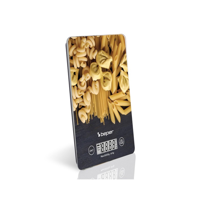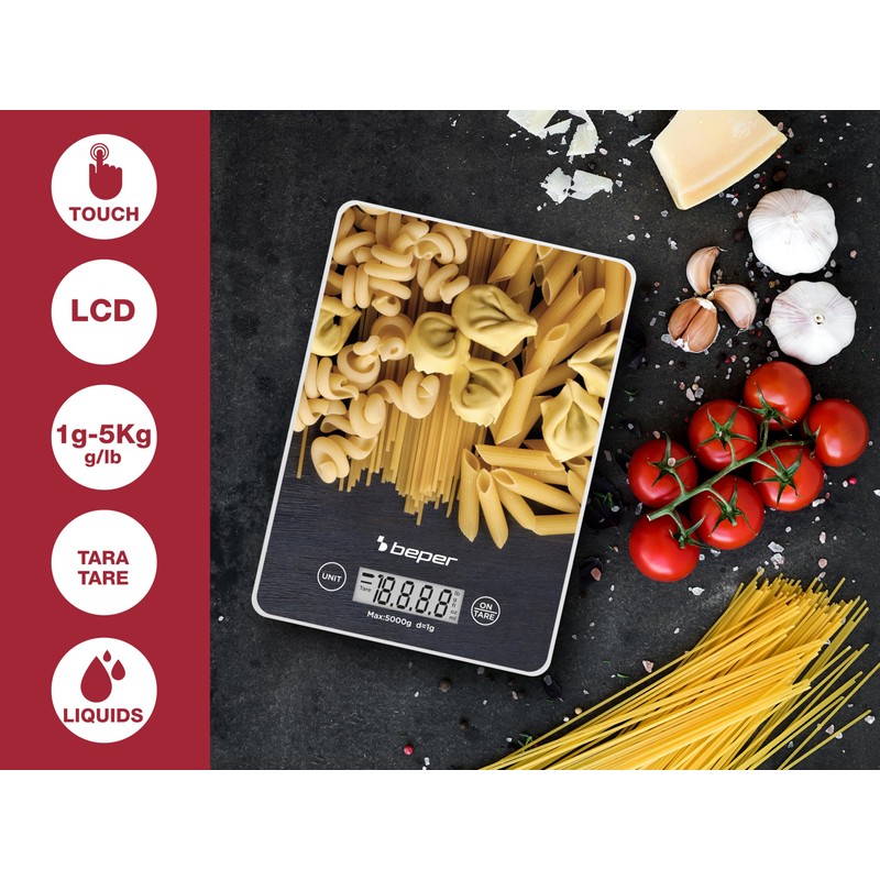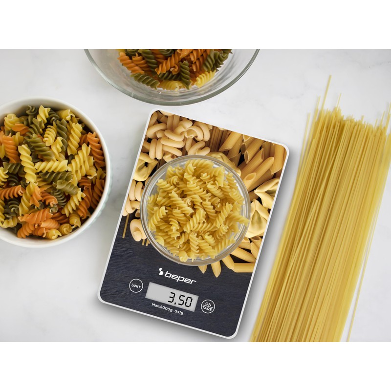 BEPER P102BIL003 Digital Kitchen Scale, Tempered Glass Top, Kitchen Scales with LCD Display and Touch Buttons, Tare Function, Maximum Capacity 5 kg, Automatic Shut-Off, Pasta Pattern