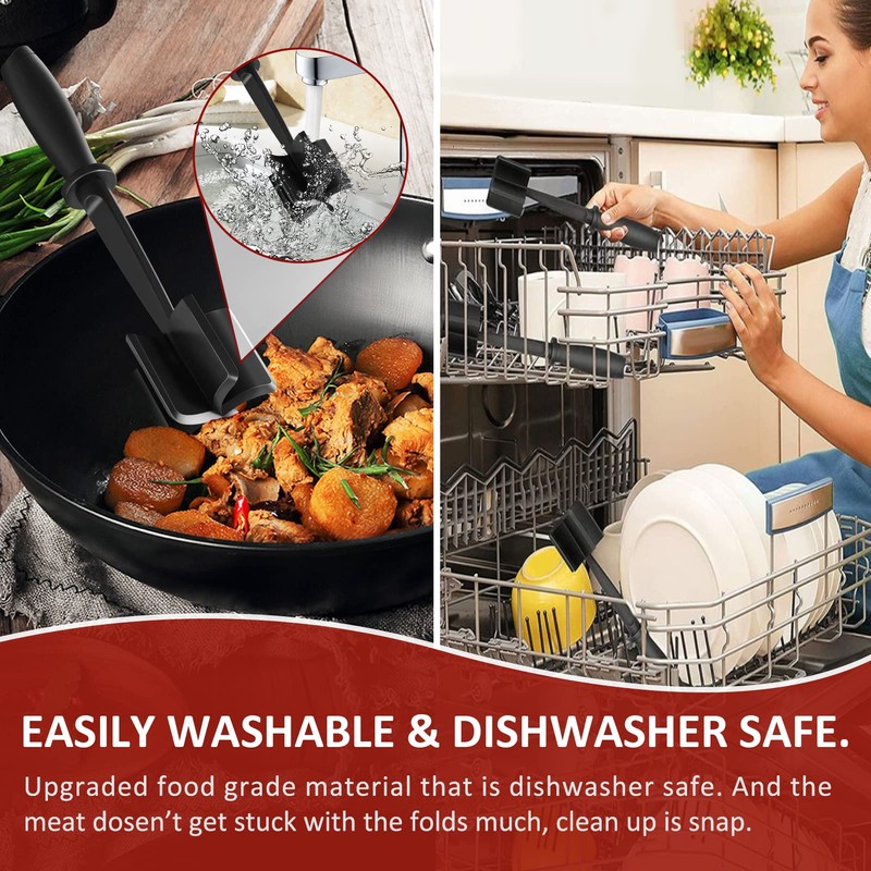 • 👩‍🍳MULTIFUNCTION:This ground beef masher is a mix and chop kitchen tool. With meat separator tool, it not only will be pretty easy to chop all kinds of meat for fast cooking, but also ideal for mixing and mashing other food types like gelatins, fruits and vegetables etc. It’s a good gift for family on Mother's Day.
