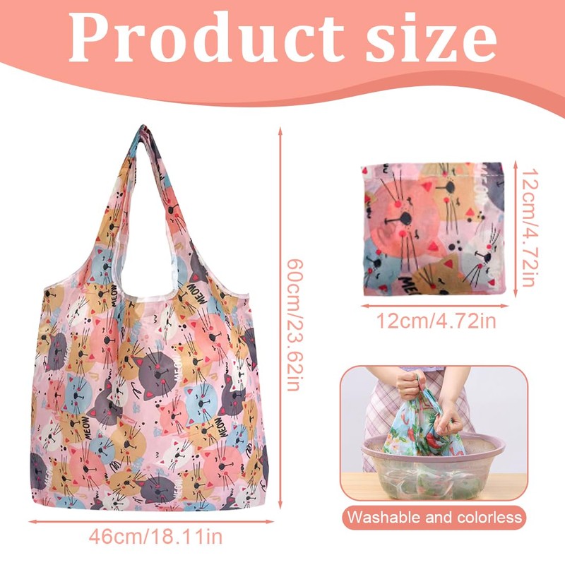 Large Capacity With 2 different cute patterns, this large shopping bag offers plenty of space. The rolled size is 35 x 46 cm with additional 25 cm handle, folded only 12 x 12 cm. Ideal for everyday use and fully covers your shopping needs