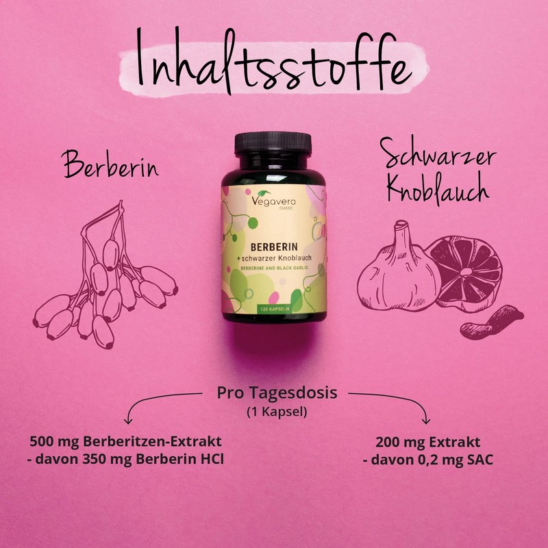 - No additives: our berberine product is free from additives such as magnesium stearate or microcrystalline cellulose. The product is suitable for vegans. Contents of one can: 120 easy to swallow capsules (4-month stock). Recommended dosage: 1 capsule per day. Note: During the garlic ageing process, the allicin content is reduced, which makes the typical sharp garlic taste disappear.