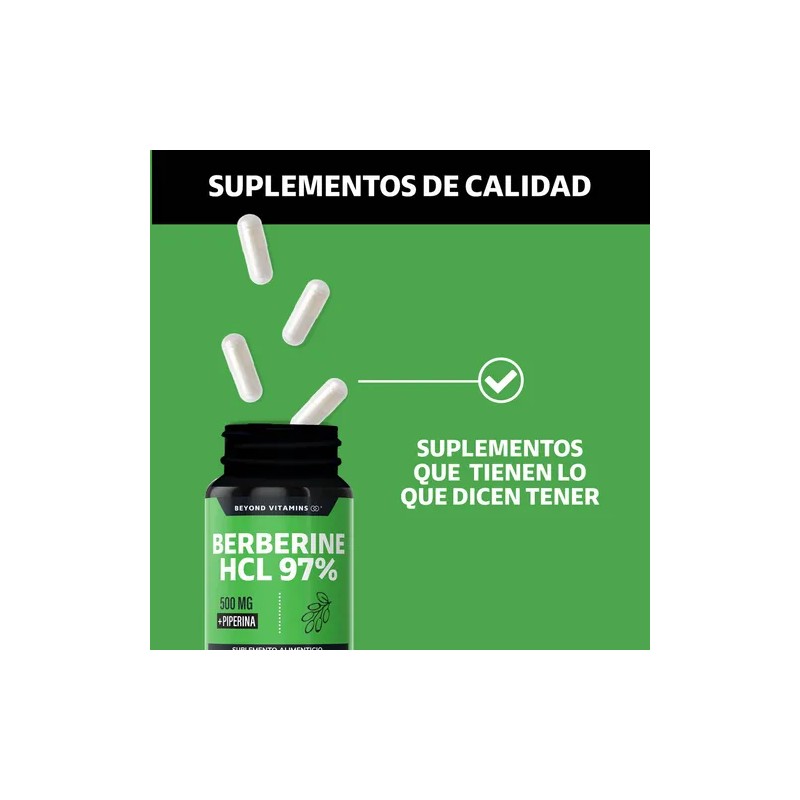 Berberina Hcl 97% | 500mg De Berberina Clorhidrato, Potenciado Con Piperina (pimienta negra) Al 97% Y Raíz de Cúrcuma (curcumina, curcuminoides) | Berberine 60 Cápsulas