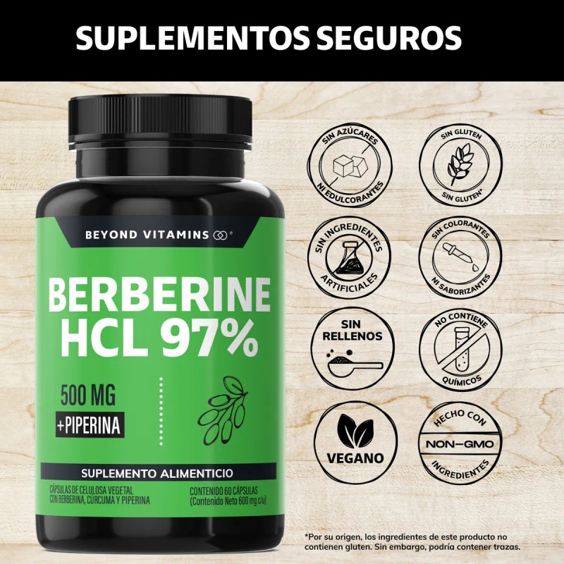 Berberina Hcl 97% | 500mg De Berberina Clorhidrato, Potenciado Con Piperina (pimienta negra) Al 97% Y Raíz de Cúrcuma (curcumina, curcuminoides) | Berberine - Vitaminas Mujer / Hombre -60 Cápsulas