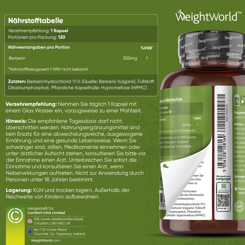 - Value for money with 4 months supply - WeightWorld offers you the benefits of barberry in easy-to-swallow capsules. Our berberine 500mg capsules are made from 95% berberine HCL. One capsule per day is more than enough and that's why we offer a continuous supply for 4 months with 120 vegan beberine capsules. WeightWorld berberine capsules are an ideal support for your body in daily life.