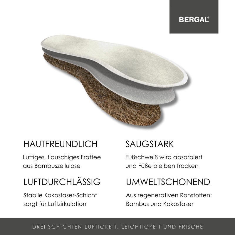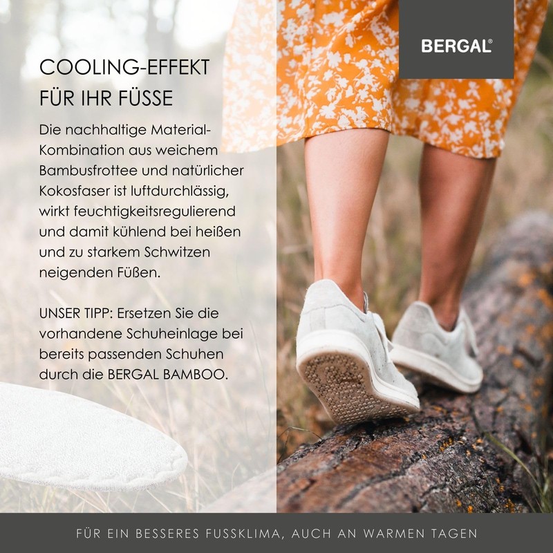• Hot, sweaty feet on warm days do not have to be. The absorbent Bergal Bamboo insoles absorb foot sweat, the foot stays dry. They are particularly suitable for people who quickly get hot feet or sweat heavily.