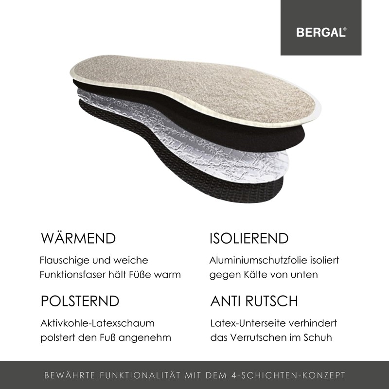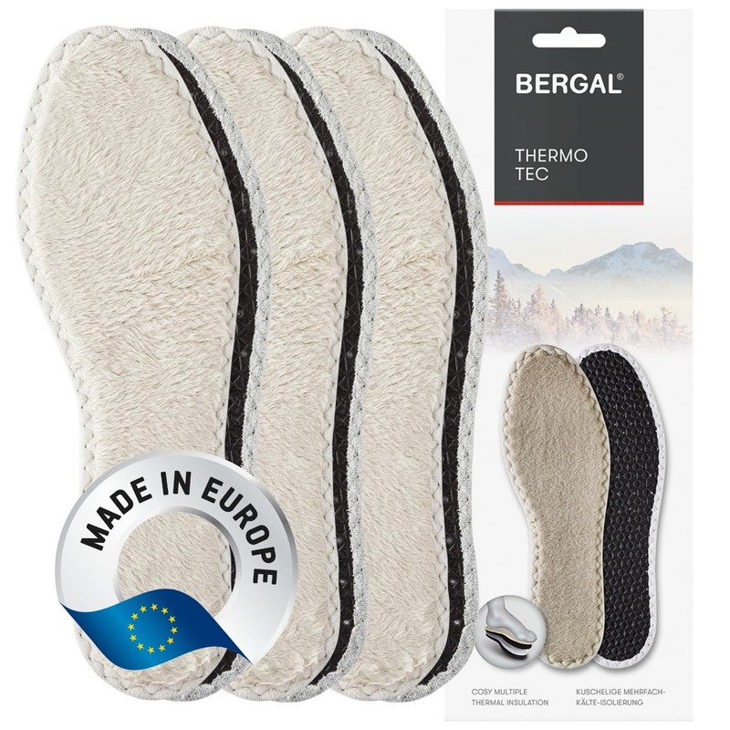 - Box contents: 3 pairs of THERMO TEC insoles from BERGAL in single size (available in shoe sizes 36 to 46). For best results, remove the existing shoe insole beforehand and replace it with the BERGAL THERMO TEC fur sole.